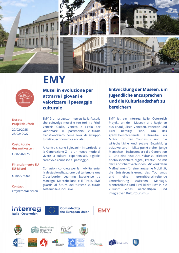 EMY è il progetto Interreg Italia-Austria che coinvolge musei e territori tra Friuli Venezia Giulia, Veneto e Tirolo per valorizzare il patrimonio culturale transfrontaliero come leva di sviluppo turistico, economico e sociale. Al centro ci sono i giovani – in particolare la Generazione Z – e un nuovo modo di vivere la cultura: esperienziale, digitale, creativo e connesso al paesaggio. EMY punta a trasformare i musei in spazi di innovazione, formazione e collaborazione con imprese e artisti, rafforzandone il ruolo come centri di contenuti, servizi ed esperienze. Con azioni concrete per la mobilità lenta, la destagionalizzazione del turismo e una Cross-border Learning Experience tra Maniago, Montebelluna e il Tirolo, EMY guarda al futuro del turismo culturale sostenibile e inclusivo.